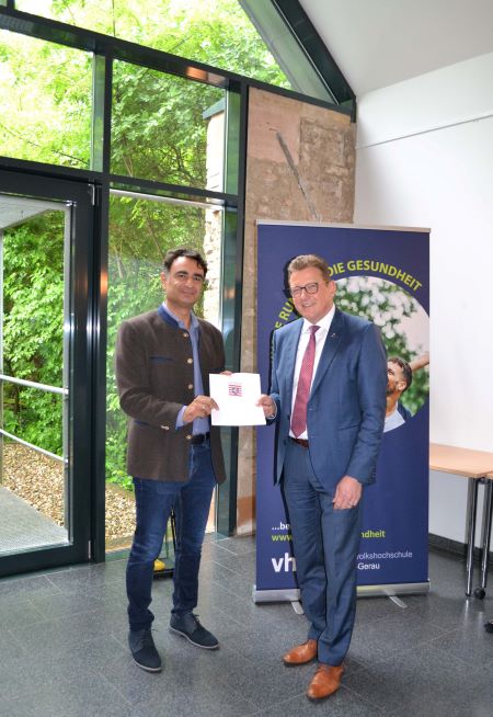 Bildunterschrift: Erster Kreisbeigeordneter Adil Oyan empfängt von Staatssekretär Stefan Sauer den Förderbescheid für die Stelle der Bewegungskoordinatorin in Groß-Gerau bei der Kreisvolkshochschule Groß-Gerau, welche kommunaler Eigenbetrieb des Kreises ist und mit ihrem Fachbereich Gesundheit, Bewegung, Entspannung und Ernährung die Aufgabe erfüllen kann.